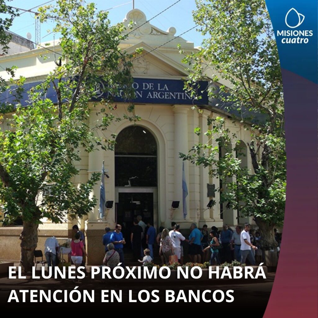Los bancos públicos y privados de todo el país no brindarán atención al público el próximo lunes, aunque sí estará habilitada la operatoria online y los cajeros automáticos.