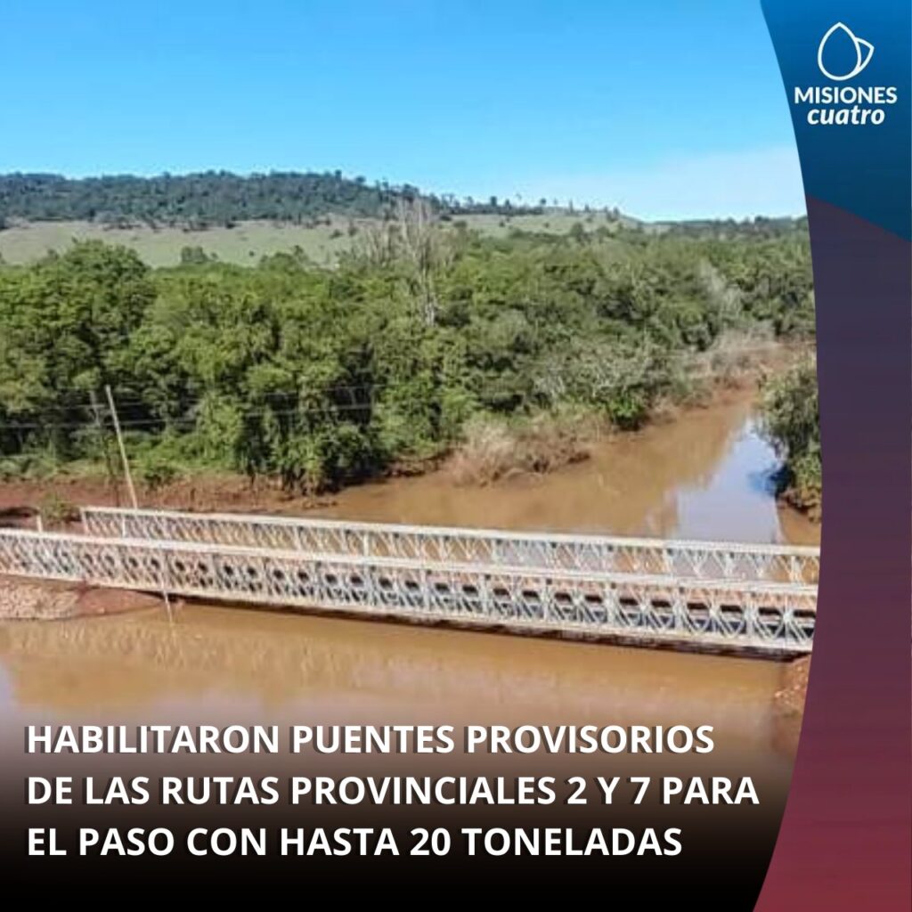 La Dirección Provincial de Vialidad (DPV) informó que está en funcionamiento el puente provisorio militar para trasponer el curso del arroyo Pindaytí por ruta provincial N° 2 entre los municipios de Alba Posse y 25 de Mayo. En la misma situación se encuentra el puente provisorio de ruta provincial N° 7 sobre el arroyo Tabay en Jardín América.