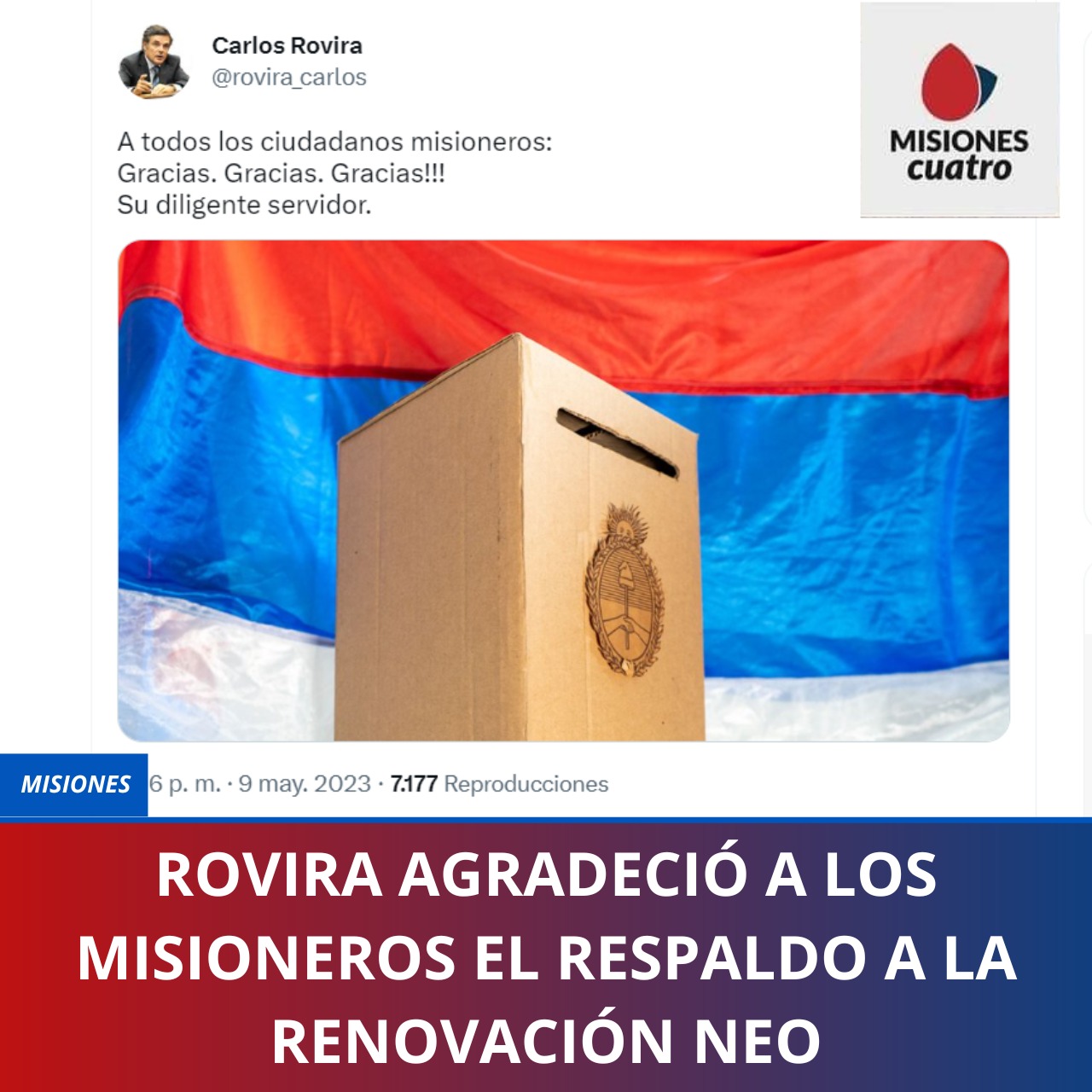 El presidente de la legislatura Carlos Eduardo Rovira utilizó sus redes sociales para agradecer a los misioneros por el respaldo a la Renovación Neo reflejado en las urnas el último domingo.