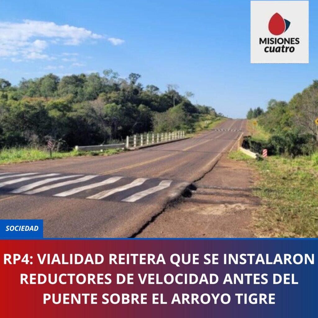 La Dirección Provincial de Vialidad (DPV) recordó que existen nuevos reductores de velocidad por tareas de mantenimiento del puente sobre el arroyo Tigre, en Ruta Provincial N° 4, en inmediaciones de la zona urbana de la localidad de Bonpland.