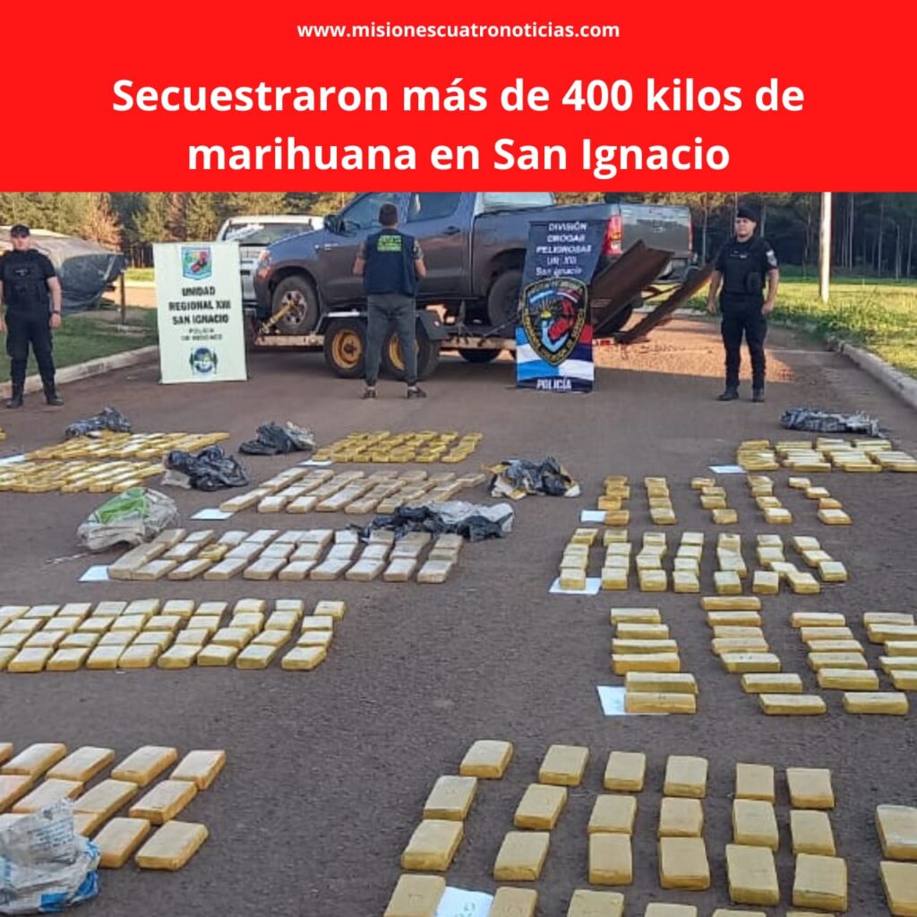 Policías incautaron más de 400 kilos de marihuana en San Ignacio. Parte de la droga se encontró en una camioneta abandonada en inmediaciones del Arroyo Yabebirí, mientras que la otra fue hallada en una zona de monte.