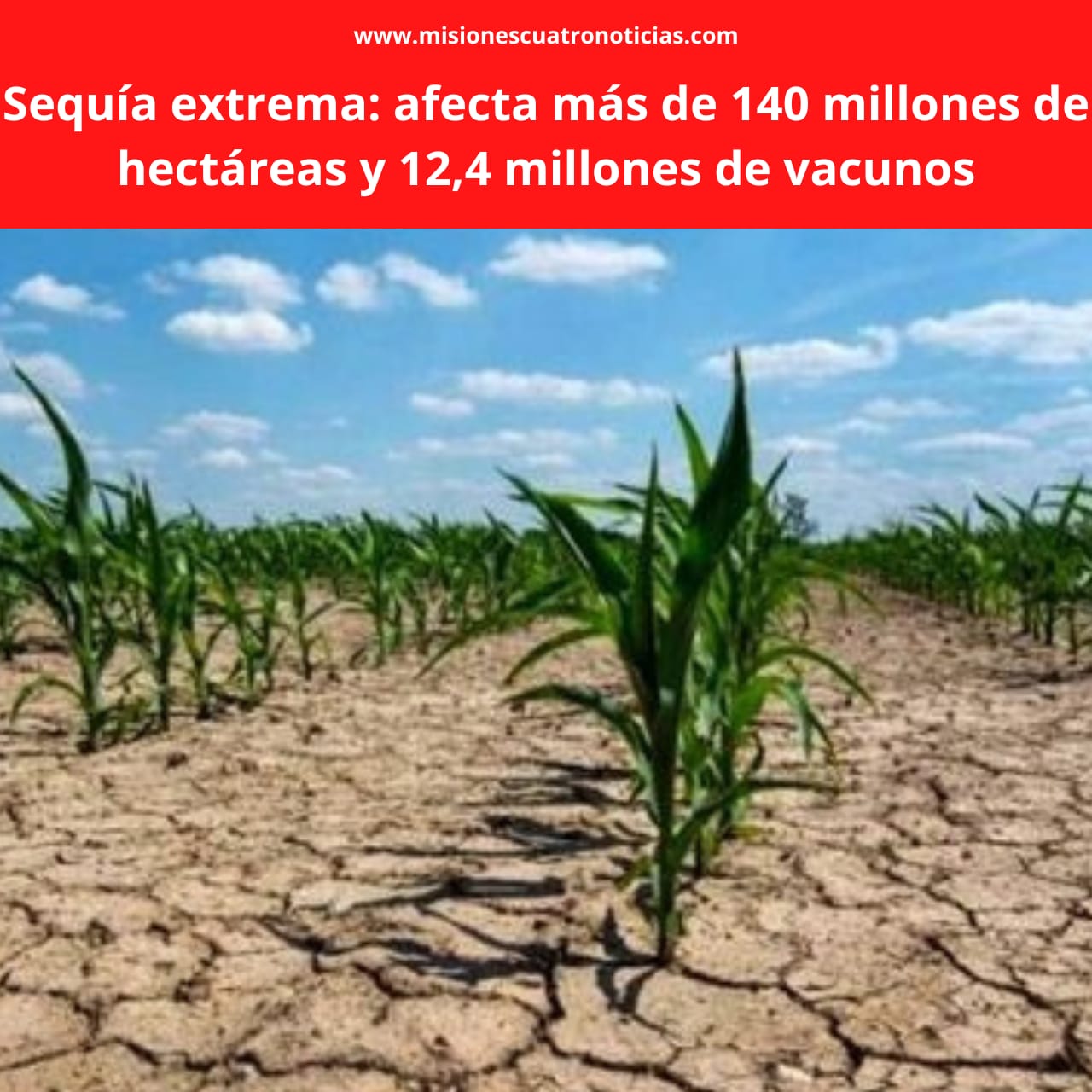 Se espera una campaña menor a las 16 millones de toneladas del cereal, pero eso no es todo, porque según un relevamiento realizado por la Mesa Nacional de Monitoreo de Sequías, comandada la secretaria de Agricultura, en total ya hay más de 140 millones de hectáreas afectadas y unas 12,4 millones de cabezas de ganado vacuno sufren por la falta de agua.