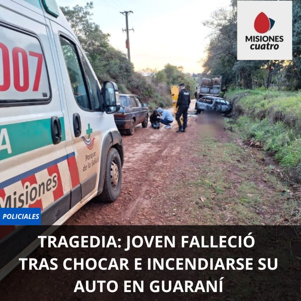 Un hombre identificado como David Martín Coimbra, de 24 años, falleció en un siniestro de tránsito ocurrido un camino vecinal del barrio Tareferos de Guaraní, donde por causas que se investigan colisionó su auto con un camión cargado con pinchadas de yerba mate y murió a causas de las lesiones sufridas producto del fuego.